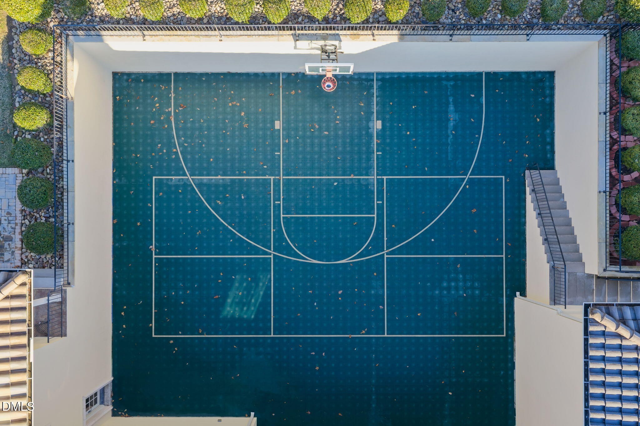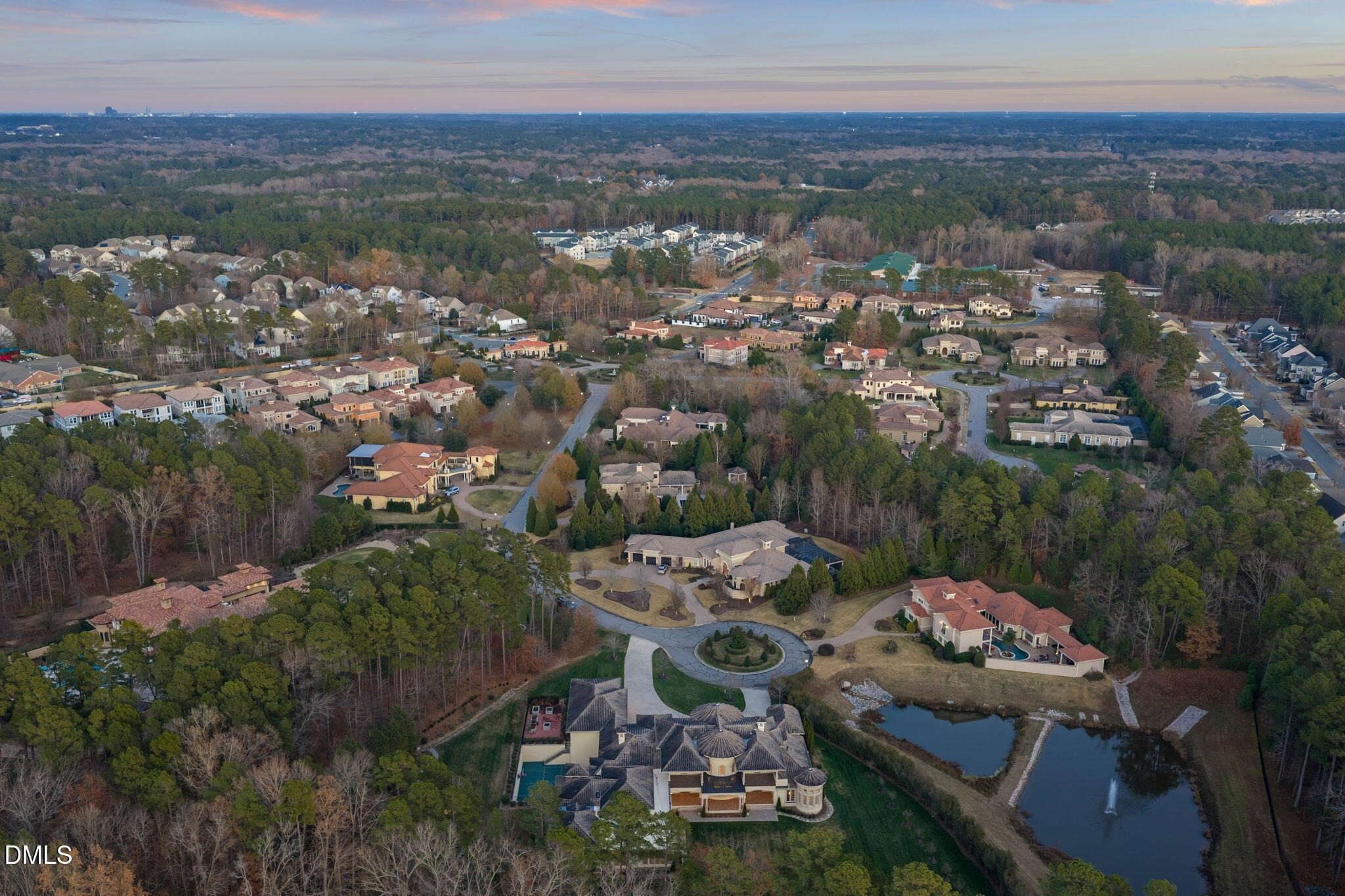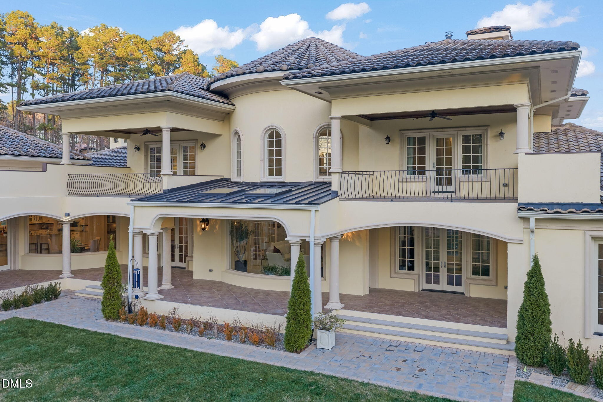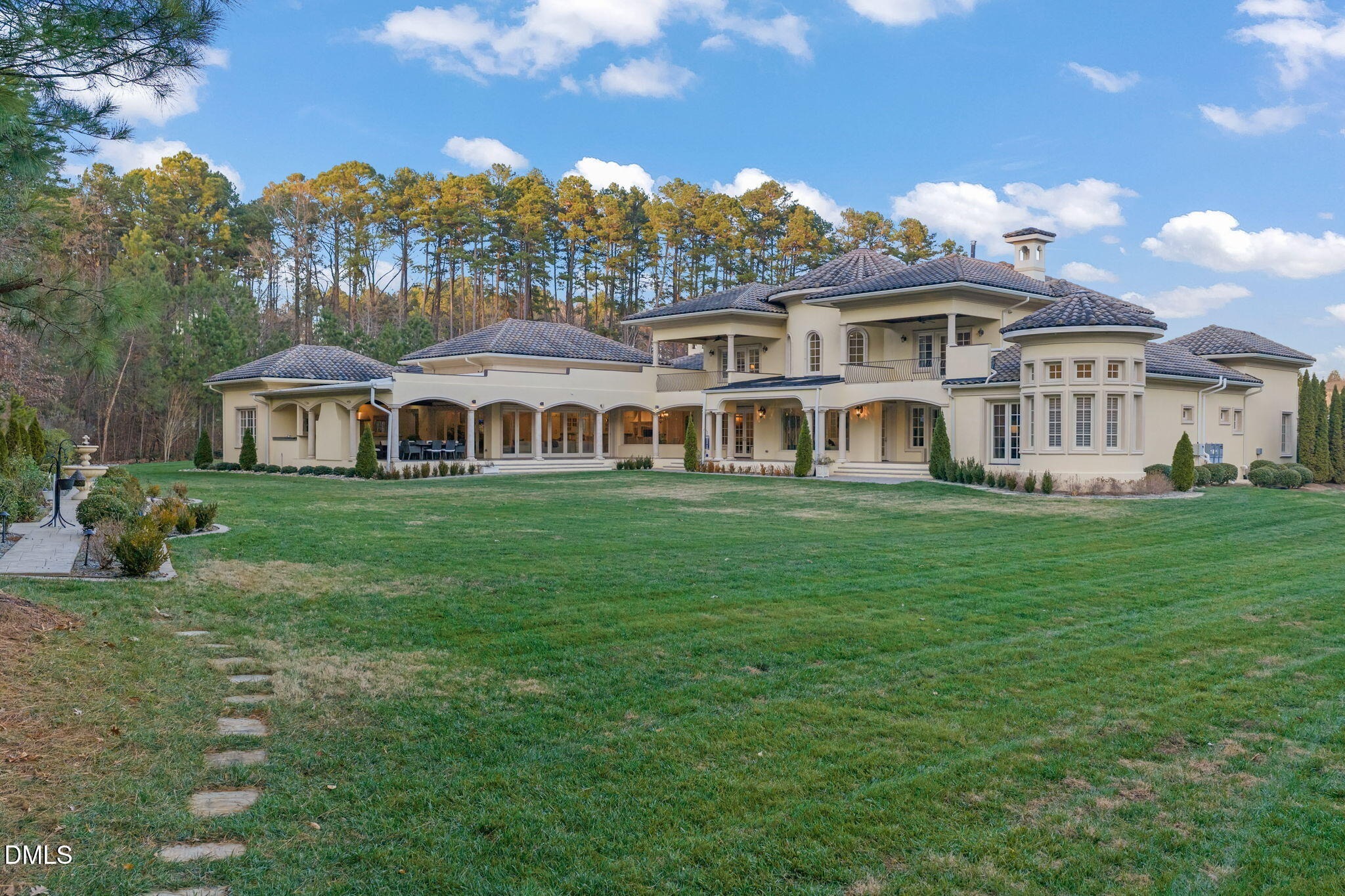Discover refined elegance in this 13,341 sq. ft. Mediterranean-inspired estate on 3.31 private acres in Maida Vale, one of the Triangle’s premier gated communities. Offering rare privacy with unmatched convenience, this in-town estate sits minutes from RTP, RDU, Duke, UNC, world-class healthcare, and premier shopping. Built with ultra-durable concrete construction and a barrel-tile roof, it delivers lasting quality, energy efficiency, and peace of mind. Designed for both everyday luxury and large-scale entertaining, the home features an expansive covered veranda with an outdoor kitchen, fireplace, lounge area, and retractable window walls; a private sports court; a separate gym with steam shower; a movie theater and wine room; and a level rear yard envisioned for a custom pool (subject to approvals). Seamless indoor/outdoor flow creates an effortless setting for gatherings of any size. A fully self-contained lower level offers exceptional flexibility for extended family or multigenerational living, complete with its own kitchen, two bedrooms, large living area with fireplace, sports court access, and private elevator. The main level includes a secluded owner’s wing with study, formal and informal living spaces, a gourmet chef’s kitchen, floor-to-ceiling windows, guest suite, second office, and direct access to the veranda. Upstairs, three spacious guest suites—including a second primary—feature private balconies overlooking the grounds. Set at the end of a quiet cul-de-sac with a circular drive and covered portico, the home welcomes you with dramatic staircases and clear views to the lush backyard. With its rare acreage, solid construction, low-maintenance design, and resort-style amenities, this residence represents exceptional value among the Triangle’s luxury estates. Conceptual pool rendering is AI-generated.